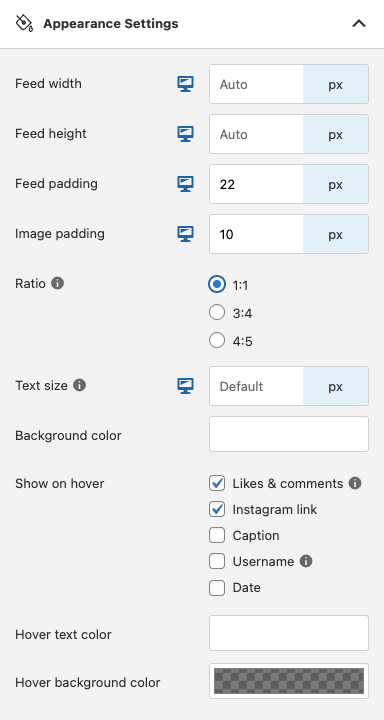 In the Appearance section of the feed editor's Design stage, you can fine-tune your design to match your website or brand's style.